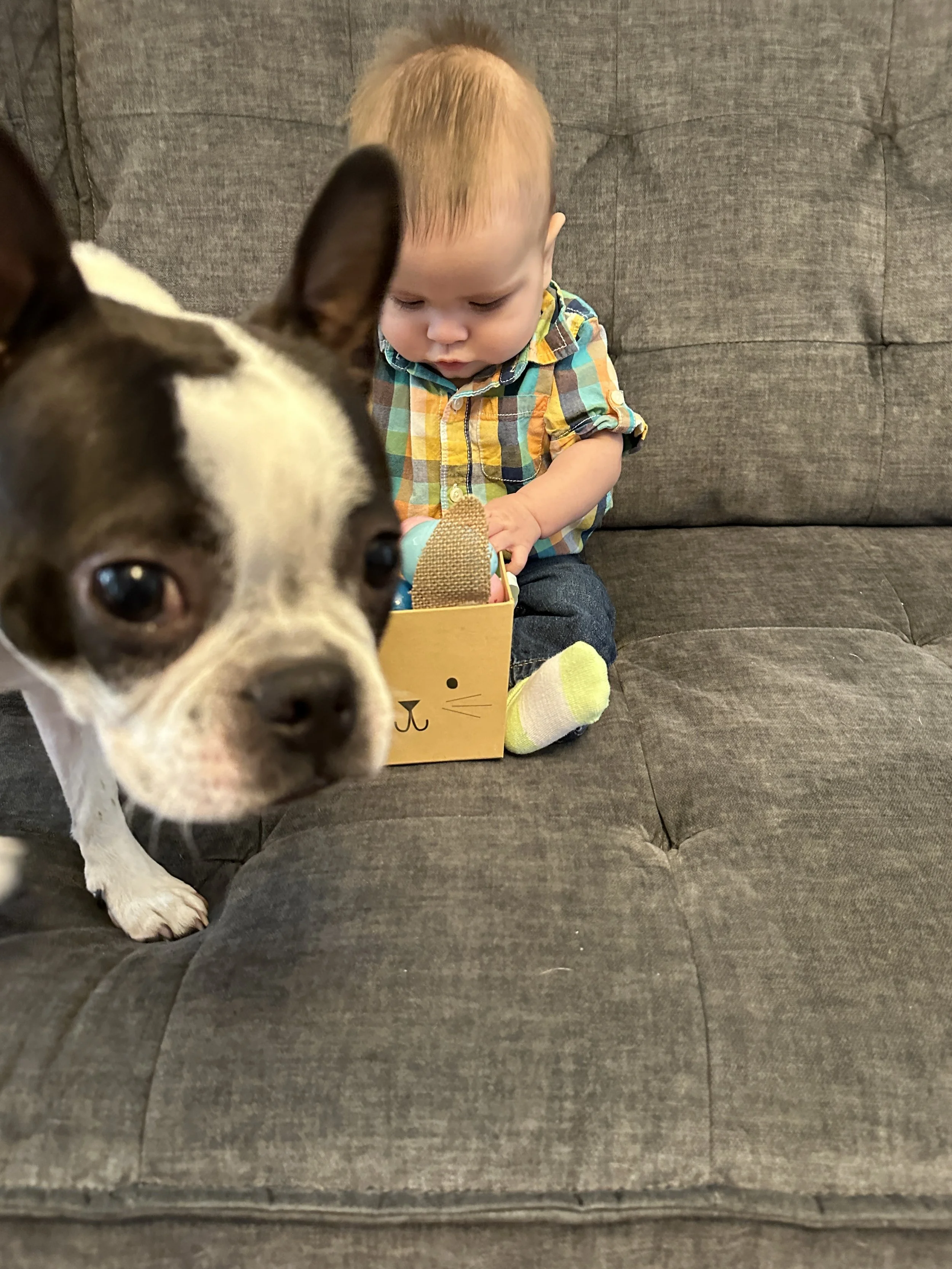 Sunday was Easter so got dressed up and gave Oscar his Easter basket. The Easter bunny left more plastic eggs and crayons for Oscar this year. He loved taking everything out of his basket. Then we went to Grandma’s house. Oscar loved playing with cousins and aunts and uncles and great grandma and grandpa of course! I think everyone got a turn to hold him at some point. My youngest cousins gave Oscar a giant golden Easter egg filled with goodies. (Side note: the golden Egg was what we used to announce that I was pregnant last Easter) He was playing on the floor with the cousins and he kept falling over which was unusual since he’s been so good at sitting lately. When I picked him up after one of these falls I realized that his fancy jeans were too tight! After I took them off he was able to sit up just fine.